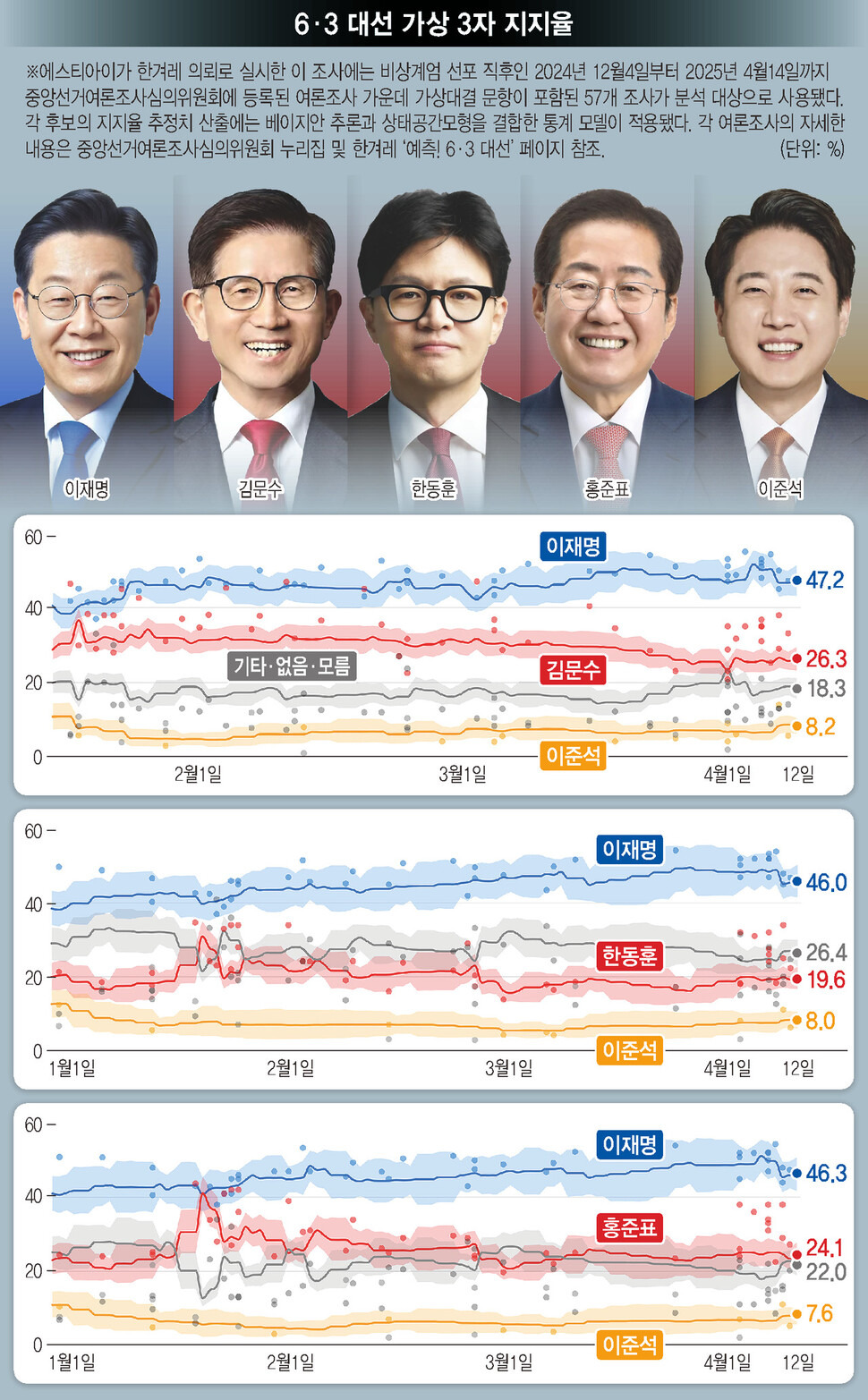 ( ☞한겨레 뉴스레터 H:730 구독하기. 검색창에 ‘한겨레 h730’을 쳐보세요.) 6·3 대선 지지율 예측 조사 서비스 바로가기 이재명 더불어민주당 전 대표가 국민의힘 후보, 이준석 개혁신당 후보와