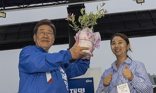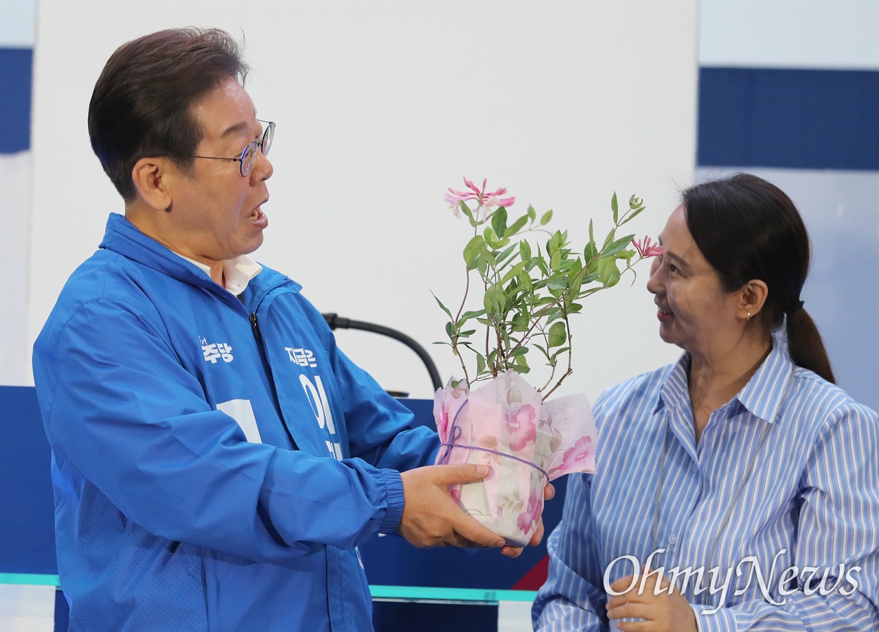 [오마이포토2025] 목포서 인동초 선물받은 이재명 후보