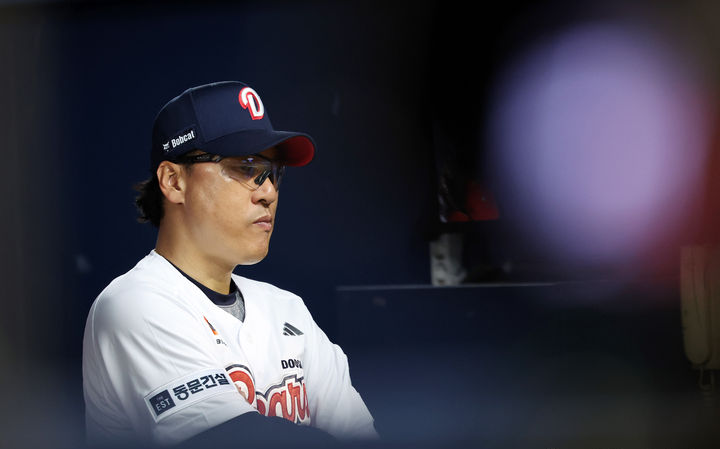 팀의 상징인 'D' 로고가 박힌 유니폼을 착용한 감독의 모습은 두산 베어스의 상징성을 잘 나타냅니다.